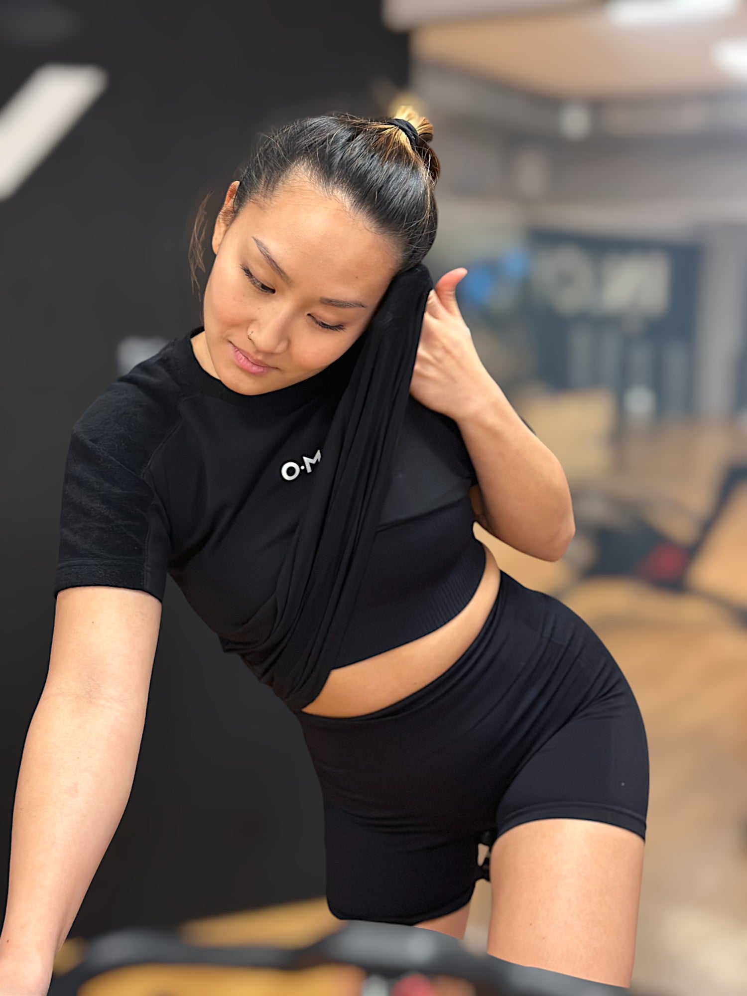 Die schweißaufsaugenden Frotteeteile, geschickt in den Schultern und am unteren Rand eingearbeitet, stehen bereit, um jeden Tropfen Schweiß aufzunehmen. Es genügt eine einfache Bewegung und der weiche Frottee gleitet sanft über deine Haut und nimmt den Schweiß auf, während du dich weiterhin frei und unbeschwert bewegen kannst.